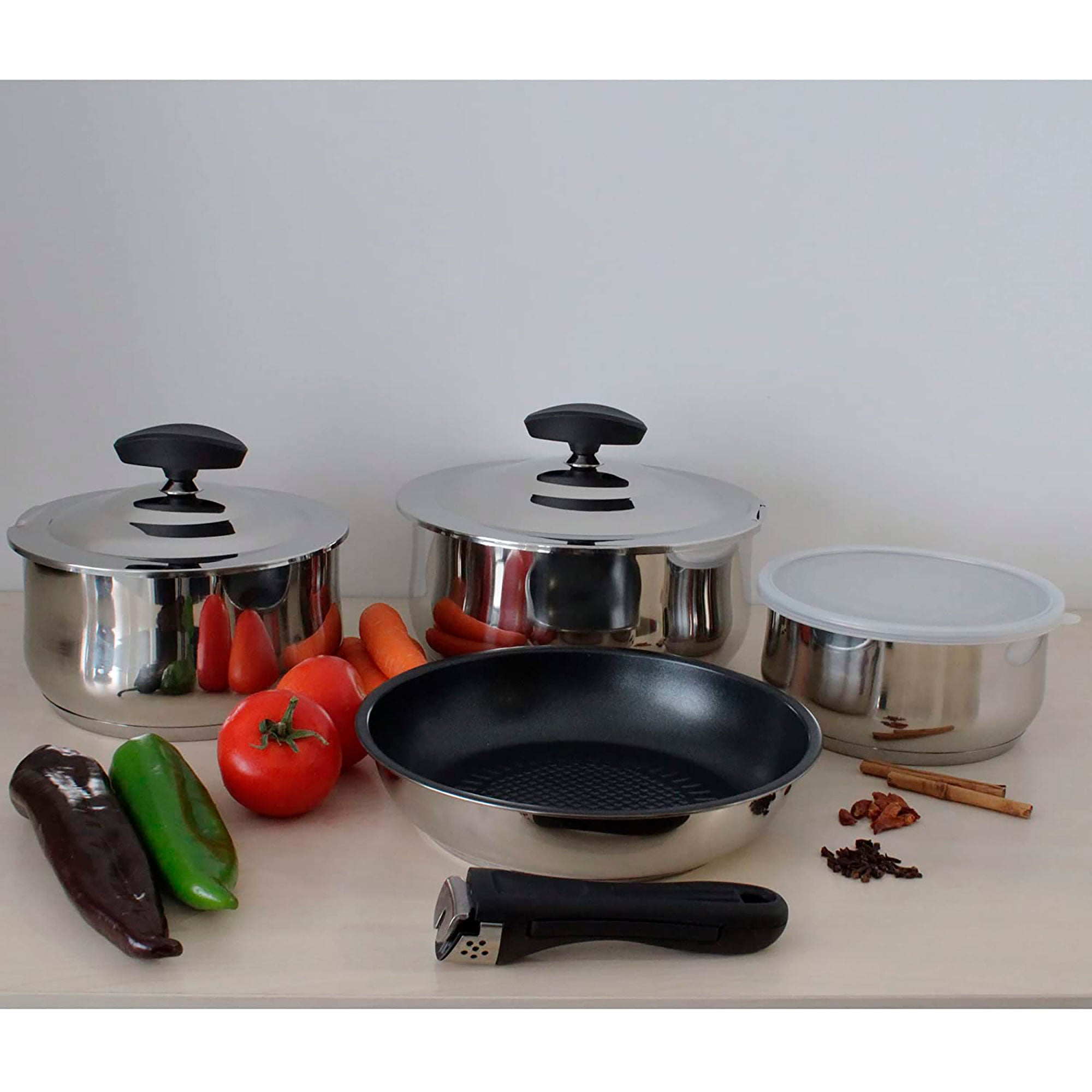 Si buscas un juego de ollas completo, bonito y que funcione en todo tipo de cocinas (incluida inducción), este Posten Anker de 7 piezas es una excelente opción. Incluye: una cazuela de 1.9 L (16 cm), una cazuela con tapa de vidrio de 2.1 L (16 cm), una olla con tapa de vidrio de 3.6 L (20 cm) y otra de 6.1 L (24 cm). Todas son de acero inoxidable satinado, con fondo encapsulado que distribuye el calor de manera uniforme y ahorra energía. Las tapas de vidrio tienen válvula de purga para evitar que hiervan. Se limpian fácilmente, son duraderas y tienen un diseño elegante. ¡Para cocinar como un chef en casa!