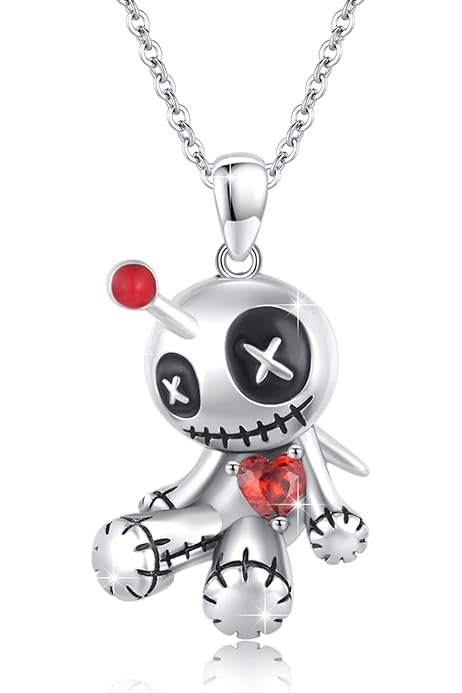 ¿Te gusta la joyería con un toque oscuro y misterioso? Este collar de muñeca vudú en plata de ley 925 es único. Tiene un colgante de murciélago con piedra lunar, que simboliza protección y amor. La cadena es ajustable (de 18 a 20 pulgadas), así que le queda bien a casi cualquier persona. Es plata de verdad, sin níquel, plomo o cadmio, ideal para pieles sensibles. Viene en una cajita de regalo bonita, perfecto para regalar en Halloween, San Valentín, cumpleaños... o para ti misma si te encanta el estilo gótico. ¡Un accesorio que no pasa desapercibido!