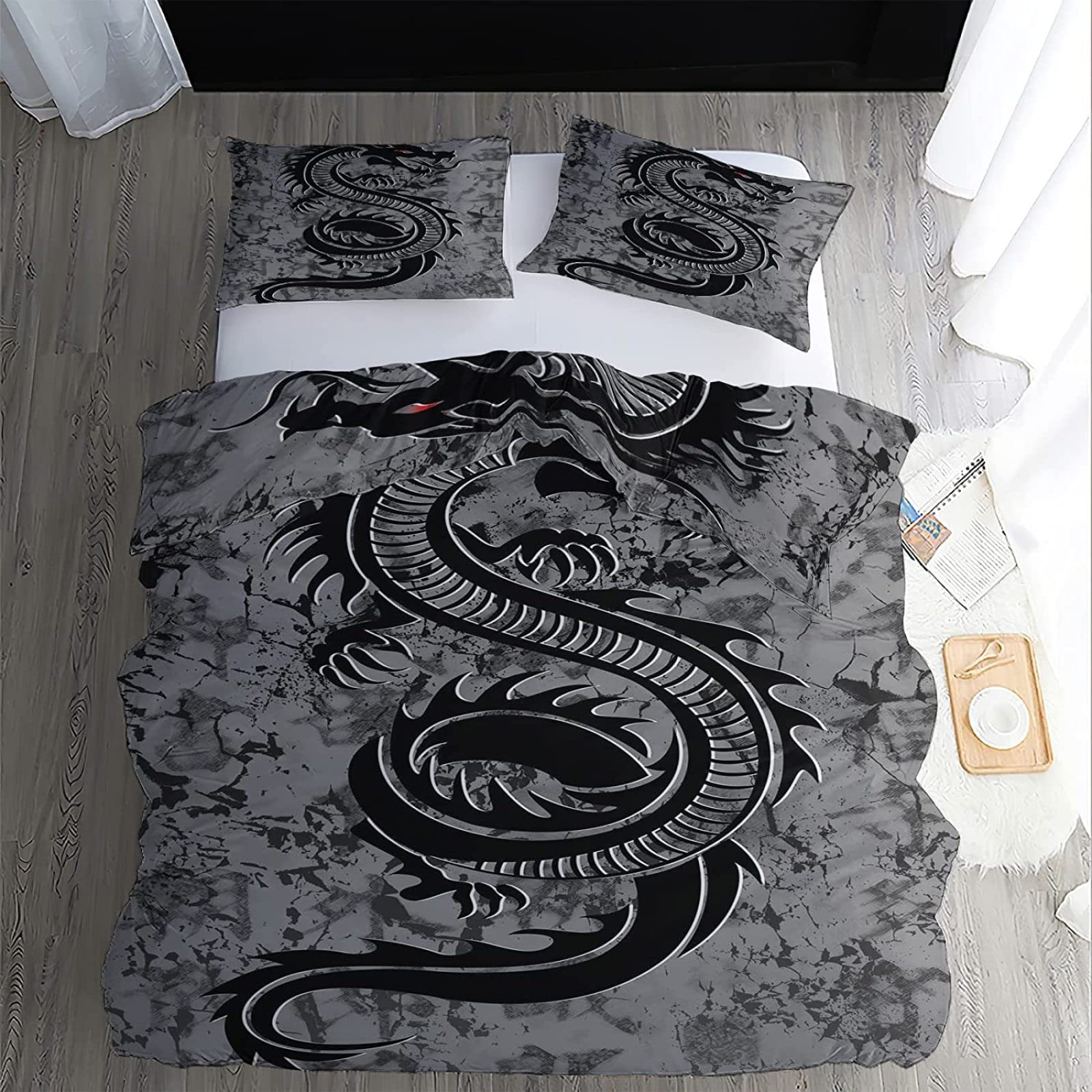 Juego De Cama 3 Piezas Con Estampado De Dragón Negro - Funda Nórdica 150x220 Cm Y 2 Fundas De Almohada 50x75 Cm